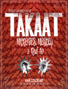 TAKAAT return to Ithaca for an incredible evening with Microbes, Mostly and Red40! 7PM Doors. All ages. $10 advance. $15 day of show. No fee presale tickets available here! FREE parking at South Hill Business Park. Follow signs for HCA! With bass drones cranked way past 11, frantic guitar shredding passages, and blown out drum…