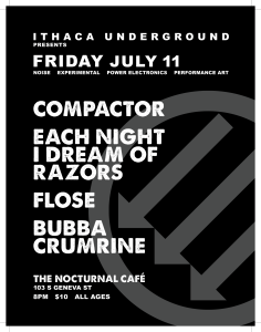 COMPACTOR returns to Ithaca to perform “Institutionalized Genocide” – a scathing industrial noise and visual performance plus the Ithaca return of Flose, Each Night I Dream Of Razors (new power electronics from Lexi Turner), and new works from Bubba Crumrine.